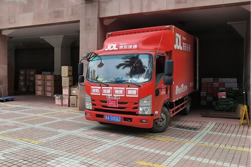 安利捐贈的防疫物資裝車后被火速運往荔灣區(qū)防控辦