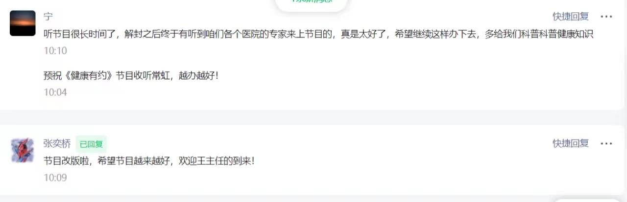 聽眾朋友通過欄目電話和微信公眾平臺(tái)的渠道積極與嘉賓互動(dòng),紛紛表示自己和家人都非常期待《健康有約》節(jié)目開播,希望以后能和更多權(quán)威專家互動(dòng)。聽眾也表示希望通過這樣一個(gè)有著官方信息渠道、權(quán)威醫(yī)藥專家搭建的直播互動(dòng)欄目來(lái)獲取科學(xué)的健康知識(shí),讓我們的身體更加健康,生活更加美好!