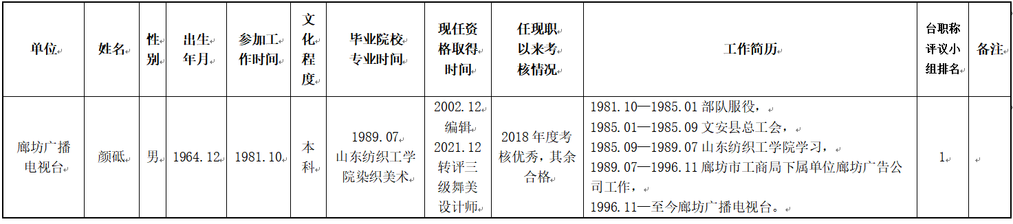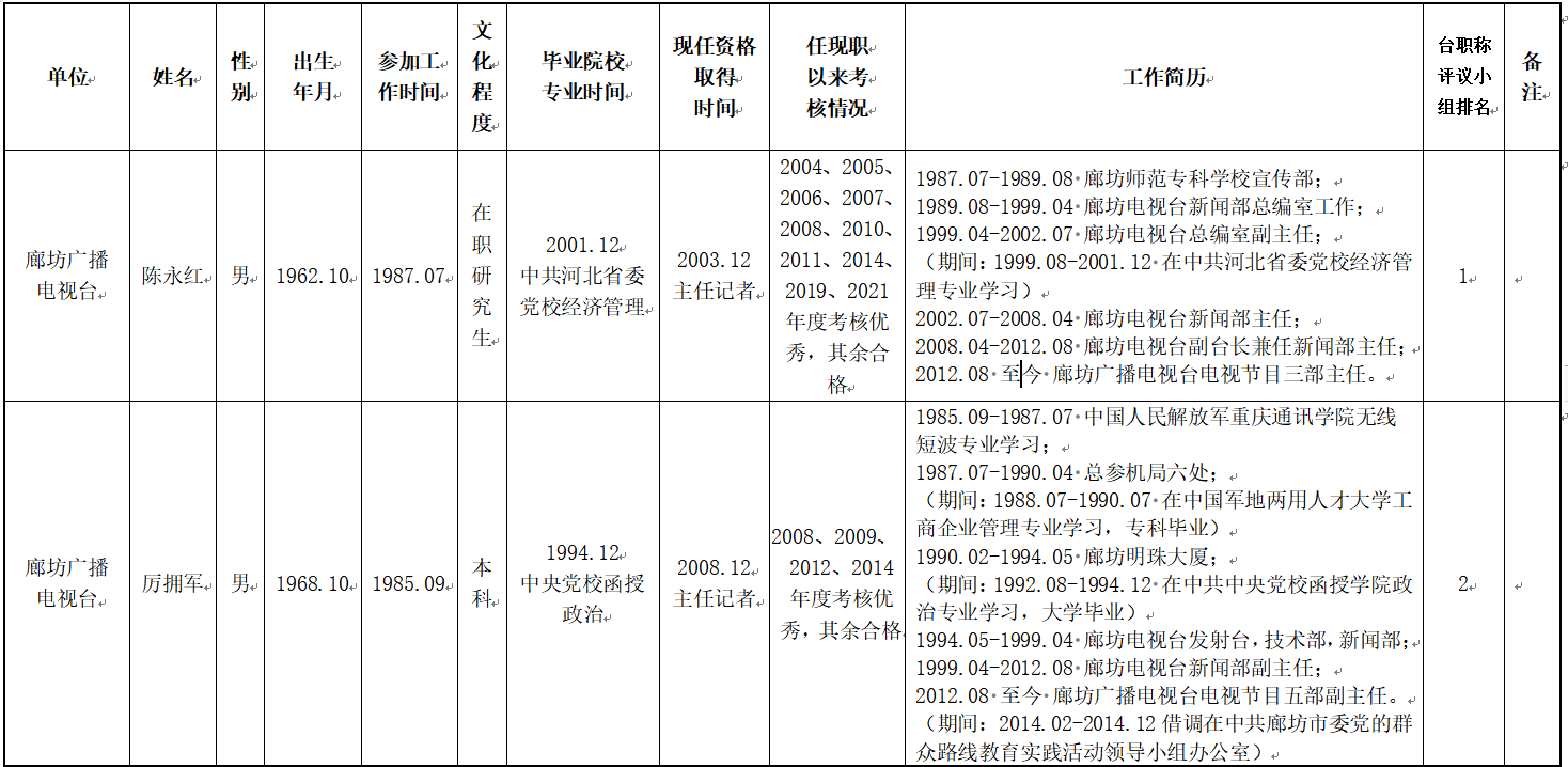 現(xiàn)將2022年度推薦申報(bào)高級(jí)專業(yè)技術(shù)職務(wù)任職資格人員情況公示如下,如有異議,請(qǐng)與廊坊廣播電視臺(tái)人力資源中心聯(lián)系。聯(lián)系人:王淑芝、付建東,聯(lián)系電話:0316-2311314。