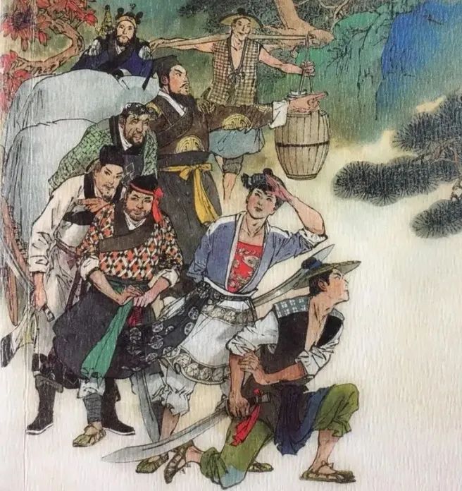 白勝挑著一擔酒桶走上岡來。眾軍漢見白勝是賣酒的,便說∶“何不買些酒吃,也解暑氣。”