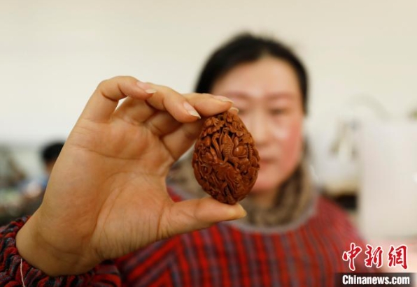 12月28日,河北省廊坊市永清縣別古莊鎮(zhèn)的一家核雕工作室內(nèi),雕刻師展示自己的核雕作品。龐趁友 攝