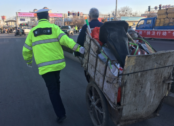 2004年的冬天,早晨7:50。天還沒亮,剛下過雪的路面還有些濕滑。一位五十多歲的老人推著一輛一人高的垃圾車有些吃力地穿過銀河大橋南側(cè)的紅綠燈路口,走到路中間時(shí)跑來一位交警,二話沒說,就幫著老人拉車。