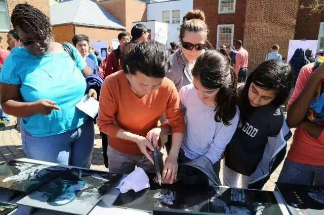 ▲方士英在國(guó)外參展,教外國(guó)友人制作石影雕