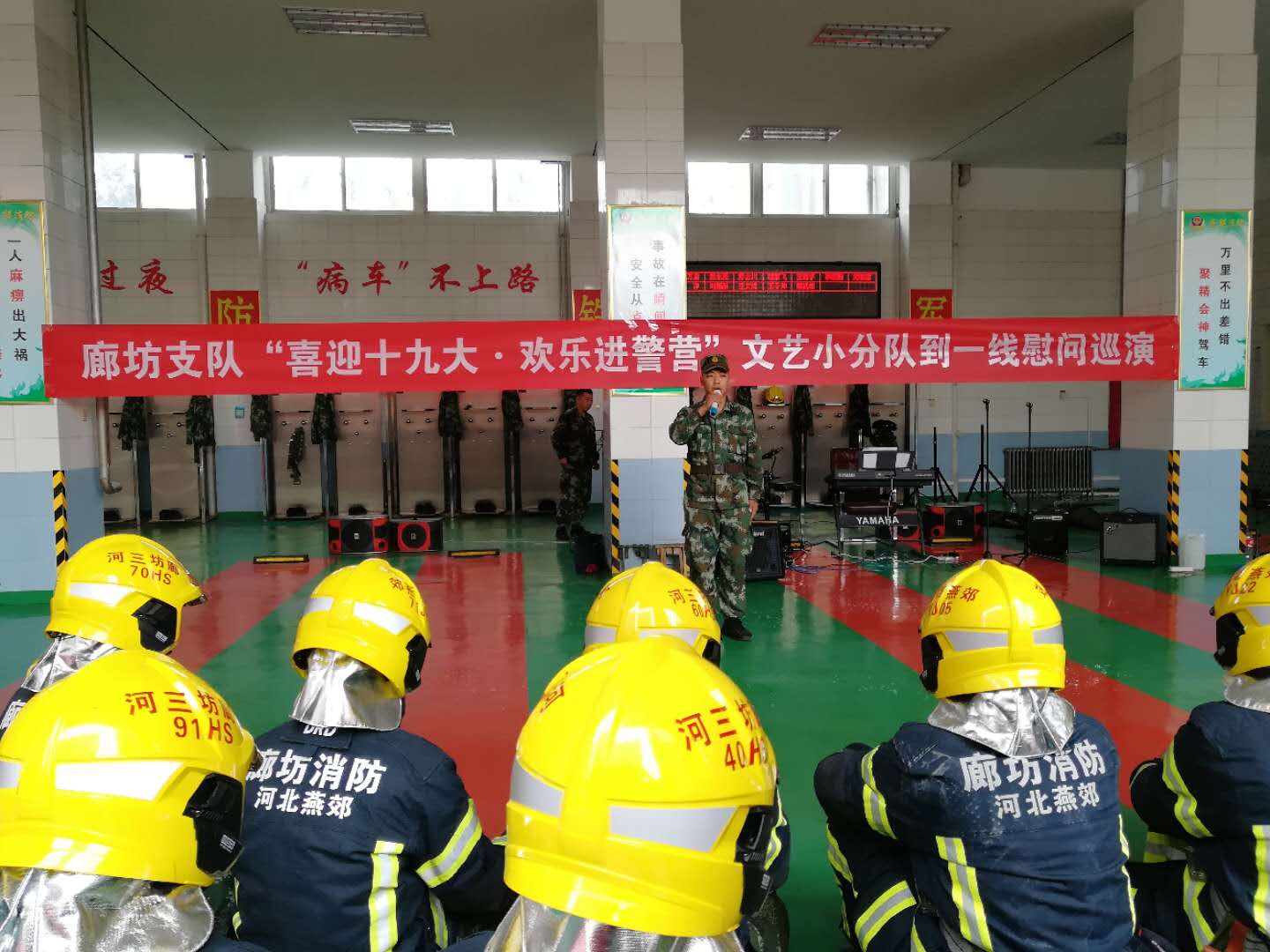 10月16日起,廊坊支隊(duì)組織開展“喜迎十九大·歡樂進(jìn)警營(yíng)”文藝小分隊(duì)到一線慰問巡演活動(dòng),把支隊(duì)黨委的關(guān)懷和慰問傳達(dá)給連續(xù)奮戰(zhàn)在安保一線的全體消防官兵、文職人員和專職隊(duì)員,受到了基層官兵的熱烈歡迎。