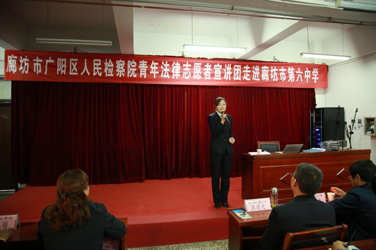 為進(jìn)一步加深青少年學(xué)生對(duì)法治觀念的認(rèn)識(shí),提升青少年學(xué)生法治素養(yǎng)和法律意識(shí),11月1日,廊坊市廣陽區(qū)人民檢察院青年法律志愿者宣講團(tuán)聯(lián)合北華航天學(xué)院文法系社工專業(yè)的學(xué)生,共同走進(jìn)廊坊市第六中學(xué),開展“綻放青春 守望正義——情緒管理”為主題的法治宣教活動(dòng)。廊坊市檢察院未檢處處長(zhǎng)盧存各、廣陽區(qū)檢察院副檢察長(zhǎng)張建光、廣陽區(qū)教育局法制安全科科長(zhǎng)谷品章、北華航天工業(yè)學(xué)院文法系老師閆麗、廊坊市第六中學(xué)校長(zhǎng)林鳳永、副校長(zhǎng)孫紅芬、團(tuán)委書記佟軍和初一年級(jí)全體班主任出席此次宣講活動(dòng)。河北電視臺(tái)、廊坊電視臺(tái)、廊坊日?qǐng)?bào)、廊坊都市報(bào)、河北新聞網(wǎng)、共產(chǎn)黨員雜志社等多家電臺(tái)媒體到現(xiàn)場(chǎng)采訪報(bào)道。