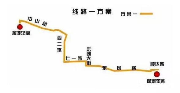 其中,1號線為保定東站始發(fā),途徑順達路、聚賢街、東風路、樂凱大街、七一路、西二環(huán),再經(jīng)由滿城區(qū)中山路,終點為滿城漢墓 。