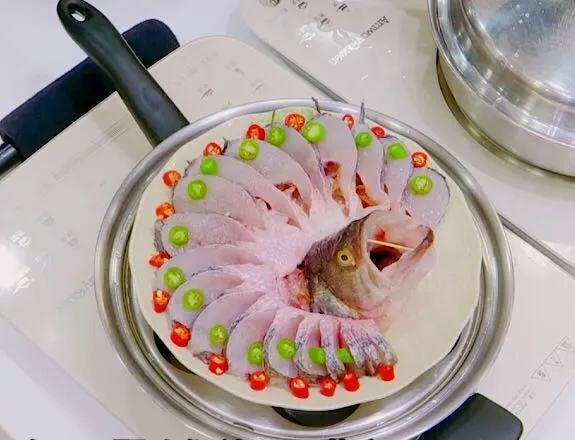 1、將魚身環(huán)切,擺成一個環(huán)形,撒上鹽、料酒,放上青紅辣椒