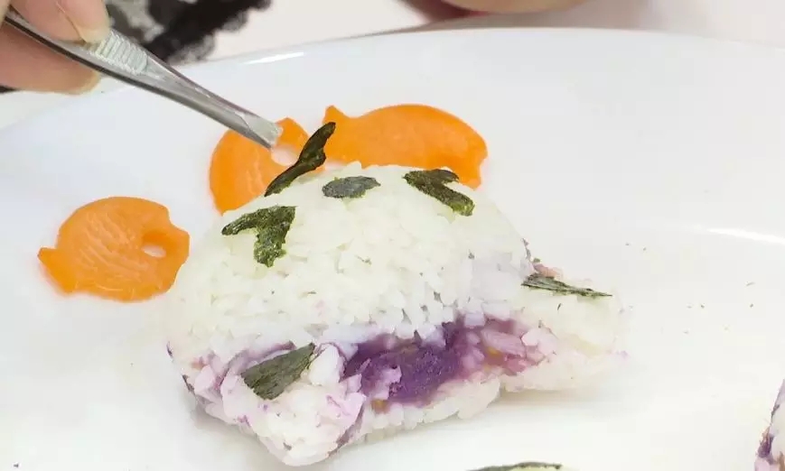用磨具將蒸熟的紅薯、紫薯與米飯、海苔做成小動物的形狀