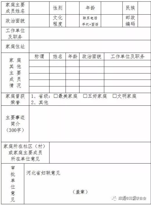 1、認(rèn)真填寫《2018年度河北省最美家庭推薦表》(見文末),并附“最美”事跡材料800字左右。