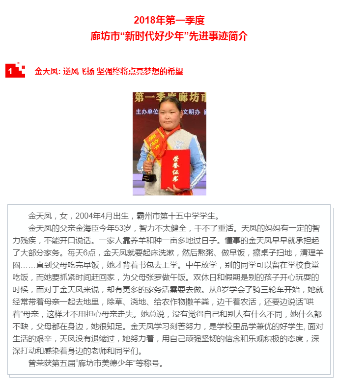 “新時(shí)代好少年”學(xué)習(xí)宣傳活動(dòng)開(kāi)展以來(lái),全市各中小學(xué)校積極參與,經(jīng)過(guò)層層推薦評(píng)審,涌現(xiàn)出金天鳳等10名廊坊市“新時(shí)代好少年”先進(jìn)典型。他們用加倍的勤奮與刻苦,不斷在學(xué)業(yè)和品行上礪煉自我,用愛(ài)心沉淀精神的沃土,用行動(dòng)傳播人間的真善美,擔(dān)當(dāng)起民族復(fù)興的偉大使命?,F(xiàn)場(chǎng)發(fā)布的10位好少年先進(jìn)事跡中, 有靠養(yǎng)羊和種一畝多地支撐家庭的好少年金天鳳;有照顧腦癱媽媽的好少年王梓瑞;有幫失語(yǔ)偏癱爸爸按摩康復(fù)的好少年王梓潤(rùn);也有自信陽(yáng)光的好少年李一……這些身邊的好少年,激勵(lì)廣大未成年人以“新時(shí)代好少年”為楷模,茁壯成長(zhǎng),百煉成鋼, 今天做祖國(guó)的好兒童,明天做祖國(guó)的建設(shè)者。
