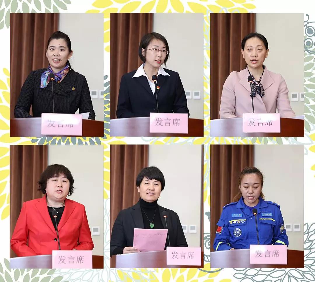 女教育工作者代表、全國“三八”紅旗手候選人、河北省“三八”紅旗手標(biāo)兵劉立華;村(社區(qū))書記代表光明西道文苑社區(qū)黨支部書記馬靜;縣級婦聯(lián)主席代表三河市婦聯(lián)主席祝志敏;最美家庭代表魯維娜;巾幗志愿講師代表王麗英;女企業(yè)家代表、廊坊市壹佰劇院管理服務(wù)有限公司董事長張穎等六位先進(jìn)典型代表分別進(jìn)行了發(fā)言。