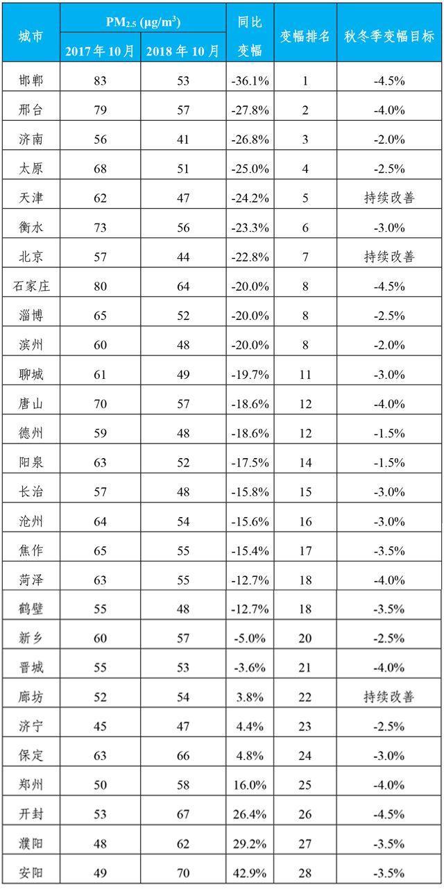 京津冀及周邊地區(qū)“2+26”城市2018年10月PM2.5濃度范圍為41~70微克/立方米(μg/m3),平均為54 μg/m3,同比下降11.5%。濃度最低的4個城市是濟南、北京、天津和濟寧(并列第3),分別為41 μg/m3、44 μg/m3、47μg/m3、47 μg/m3;濃度最高的3個城市是安陽、開封和保定,分別為70 μg/m3、67μg/m3和66 μg/m3。從改善幅度看,21個城市PM2.5平均濃度同比下降,其中20個城市PM2.5平均濃度降幅滿足秋冬季改善目標(biāo)進度要求;降幅排名前3位的邯鄲、邢臺和濟南,同比分別下降36.1%、27.8%和26.8%。安陽、濮陽、開封、鄭州、保定、濟寧、廊坊等7個城市PM2.5濃度同比不降反升,其中安陽上升幅度最大,同比上升42.9%。