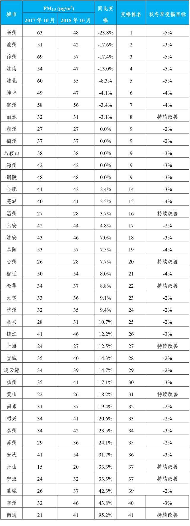 長三角地區(qū)41個城市2018年10月PM2.5濃度范圍為20~57 μg/m3,平均為40 μg/m3,同比上升5.3%。PM2.5平均濃度最低的4個城市是舟山、黃山、上海和湖州(并列第3),分別為20 μg/m3、26μg/m3、27 μg/m3、27 μg/m3;濃度最高的3個城市是阜陽、徐州和宿州,分別為57 μg/m3、57 μg/m3和56 μg/m3。從改善幅度看,8個城市PM2.5平均濃度同比下降,其中7個城市PM2.5平均濃度降幅滿足秋冬季改善目標(biāo)進度要求;降幅排名前3位的亳州、池州和徐州,同比分別下降了23.8%、17.6%和17.4%。5個城市PM2.5濃度同比持平。28個城市同比不降反升,反彈幅度最大的3個城市為南通、常州和鹽城,同比分別上升95.2%、43.8%和42.3%。