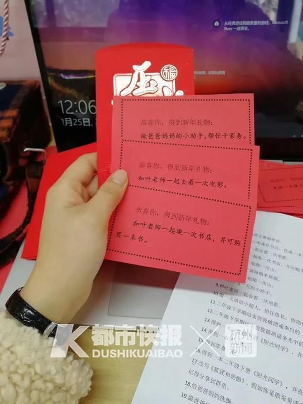 仔細(xì)閱讀每個“紅包”上的內(nèi)容,可以看出葉老師的初衷,是為了學(xué)生的全面發(fā)展。除了減免一項語文寒假作業(yè)、和葉老師一起去看一次電影、得到一個葉老師牌愛的抱抱之類的幸運獎,更多的是,做一天清潔小超人、做爸爸媽媽的小助手、制作PPT等考驗學(xué)生“德智體美勞”的作業(yè)。