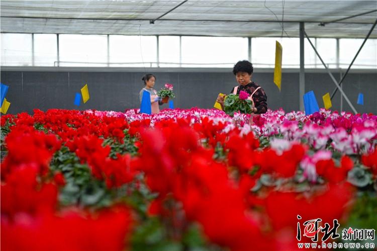 1月30日,在霸州市桑源花木種植基地,工人正在為即將上市的仙客來整理花枝。