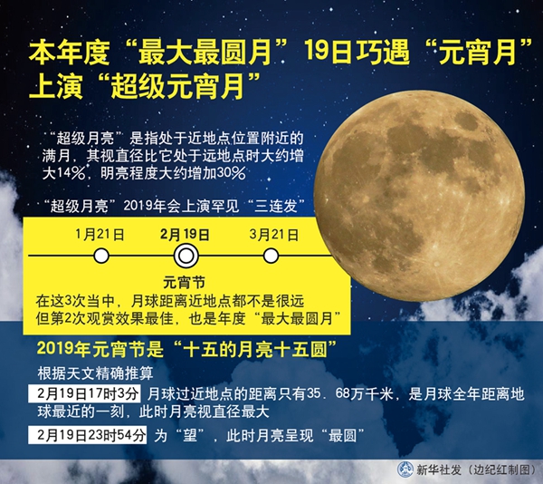 19日,元宵節(jié)。今年元宵節(jié)是“十五的月亮十五圓”。根據(jù)天文精確推算,19日17時3分月球過近地點的距離只有35.68萬千米,是月球全年距離地球最近的一刻,此時月亮視直徑最大。23時54分為“望”,此時月亮呈現(xiàn)“最圓”。