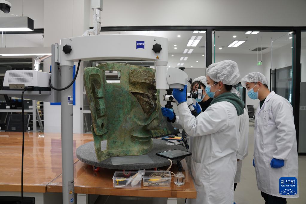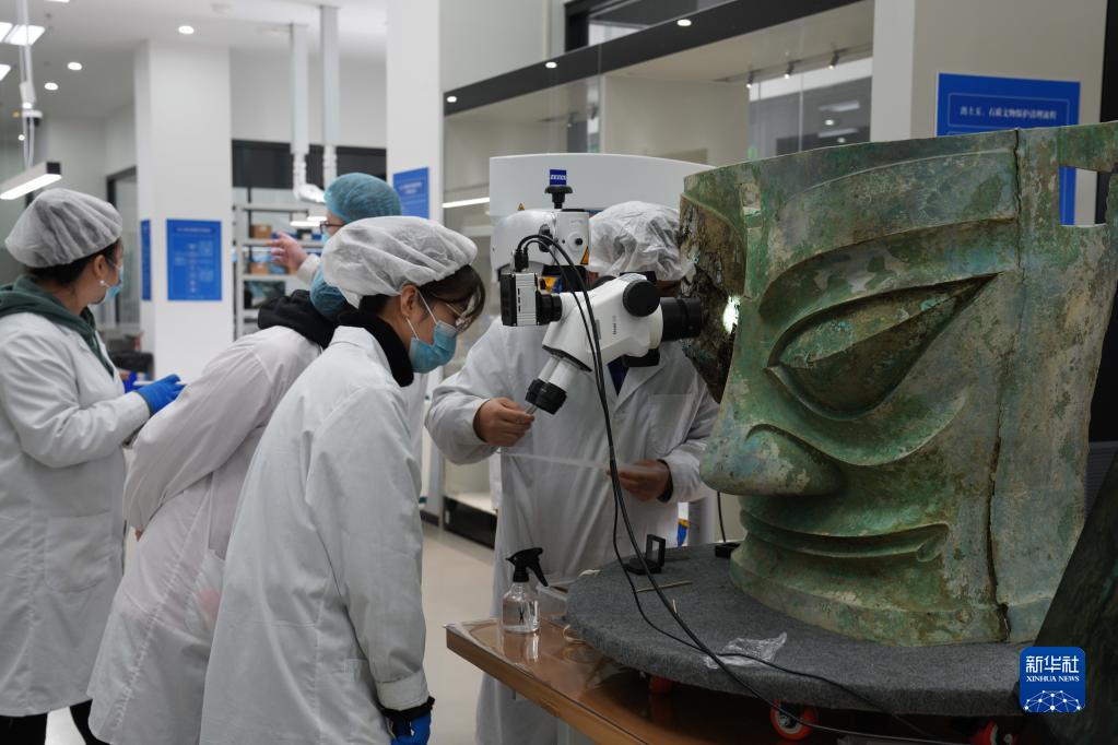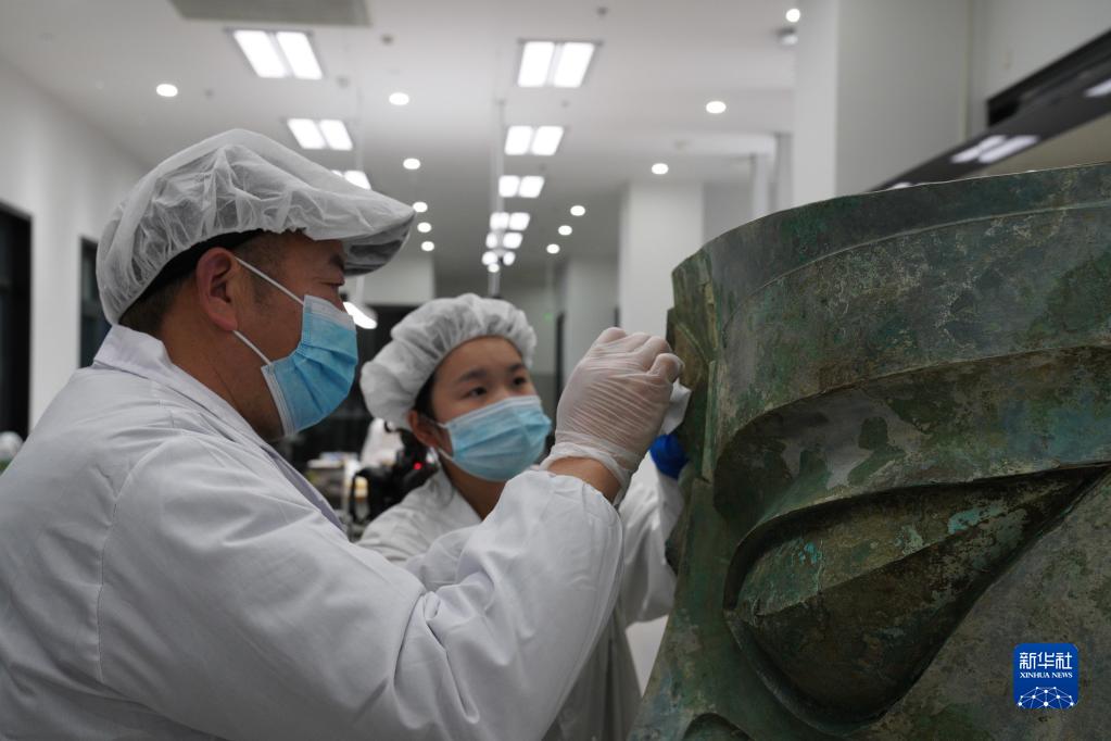 文保人員正在對(duì)三星堆遺址出土的青銅大面具進(jìn)行修復(fù)(資料圖片)。新華社發(fā)(四川省文物考古研究院、三星堆博物館供圖)