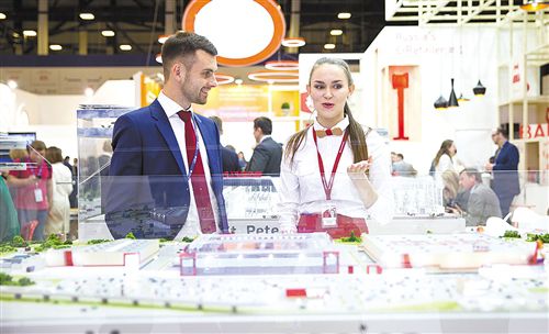 在俄羅斯圣彼得堡國際經(jīng)濟(jì)論壇展覽上,俄羅斯莫斯科州展臺(tái)的工作人員為與會(huì)者講解。新華社記者 吳 壯攝